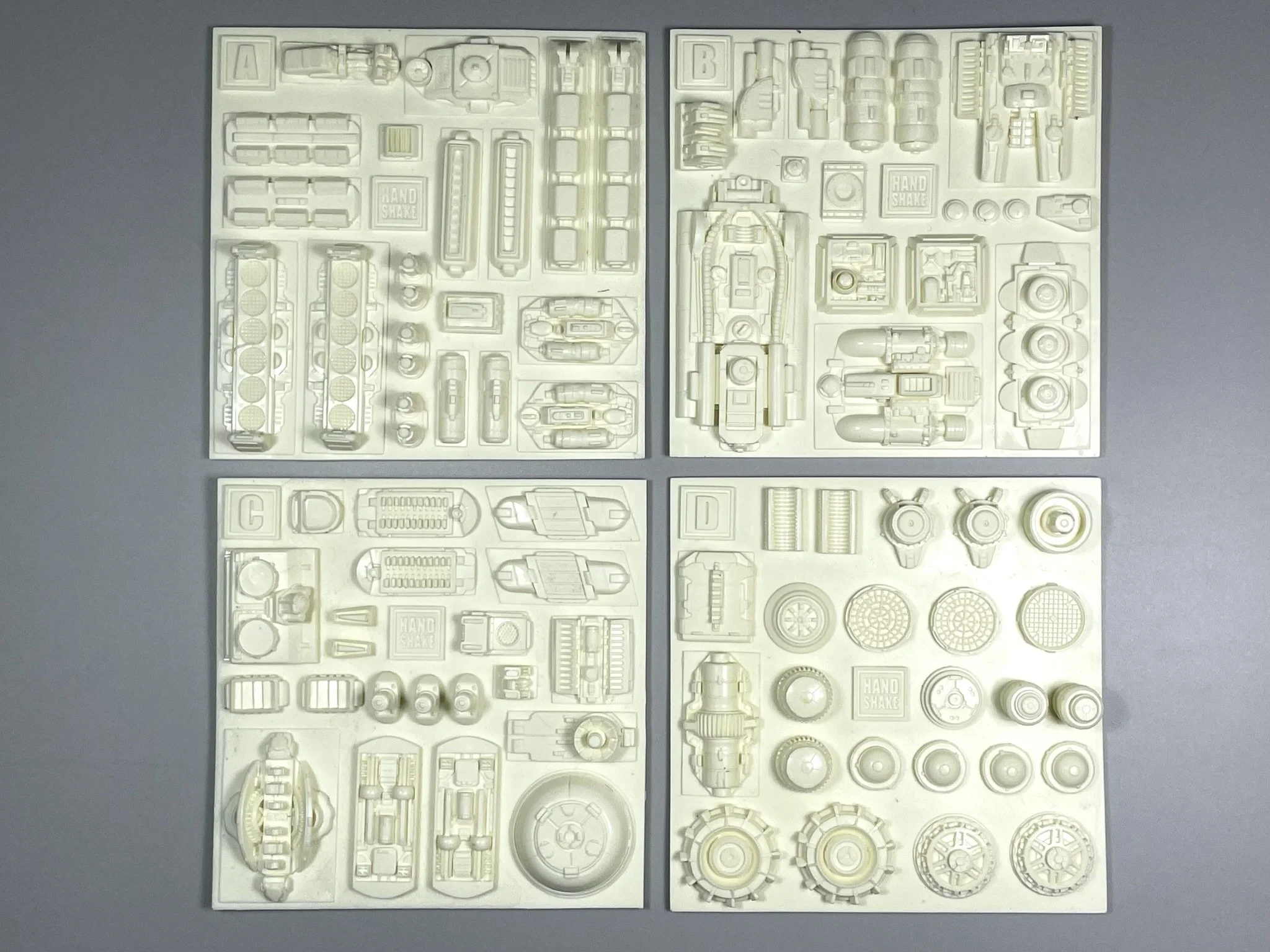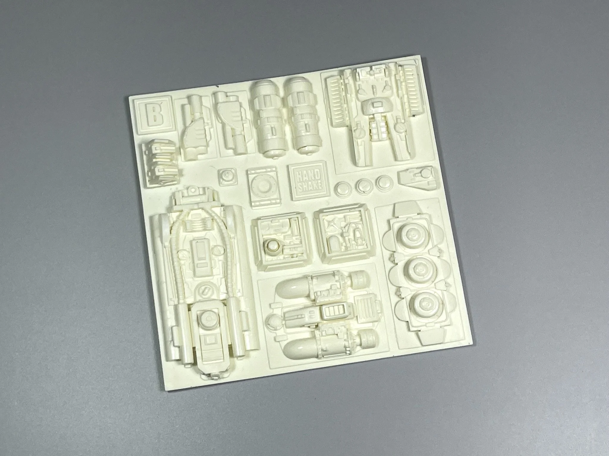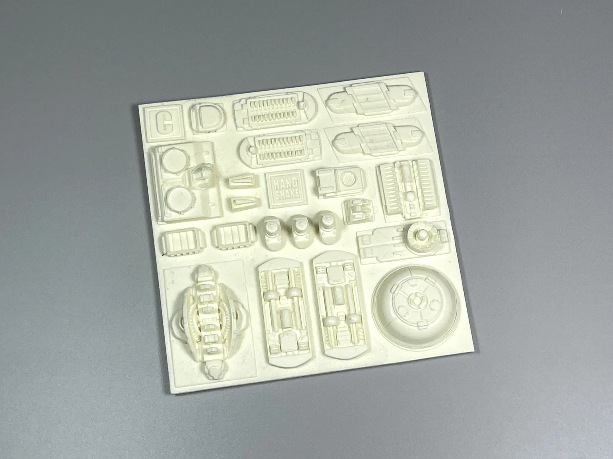 Starting from the initial idea, I began shaping the concept of a small set made up of two panels that could be cast as a single piece. Following the recommendations of my spiritual guide for this project, the pieces needed to have a flat side and be suitable for detailing the hull of his spaceship. My limited experience was mostly with mechas and robots, so I needed to do a bit of prior research (wisely helped by Carlos) to develop some ideas. But once the machine starts moving, it takes on a life of its own. I began by taking parts from my own models, kitbashing from my own work. A kids construction set and a few model pieces that happened to be on my workbench at the time did the rest. I really enjoy using everyday objects, but I always need to apply my own modifications so my models don’t end up looking like just a bunch of stuff glued together. With each piece I built and added to the set, new ideas and possibilities emerged.