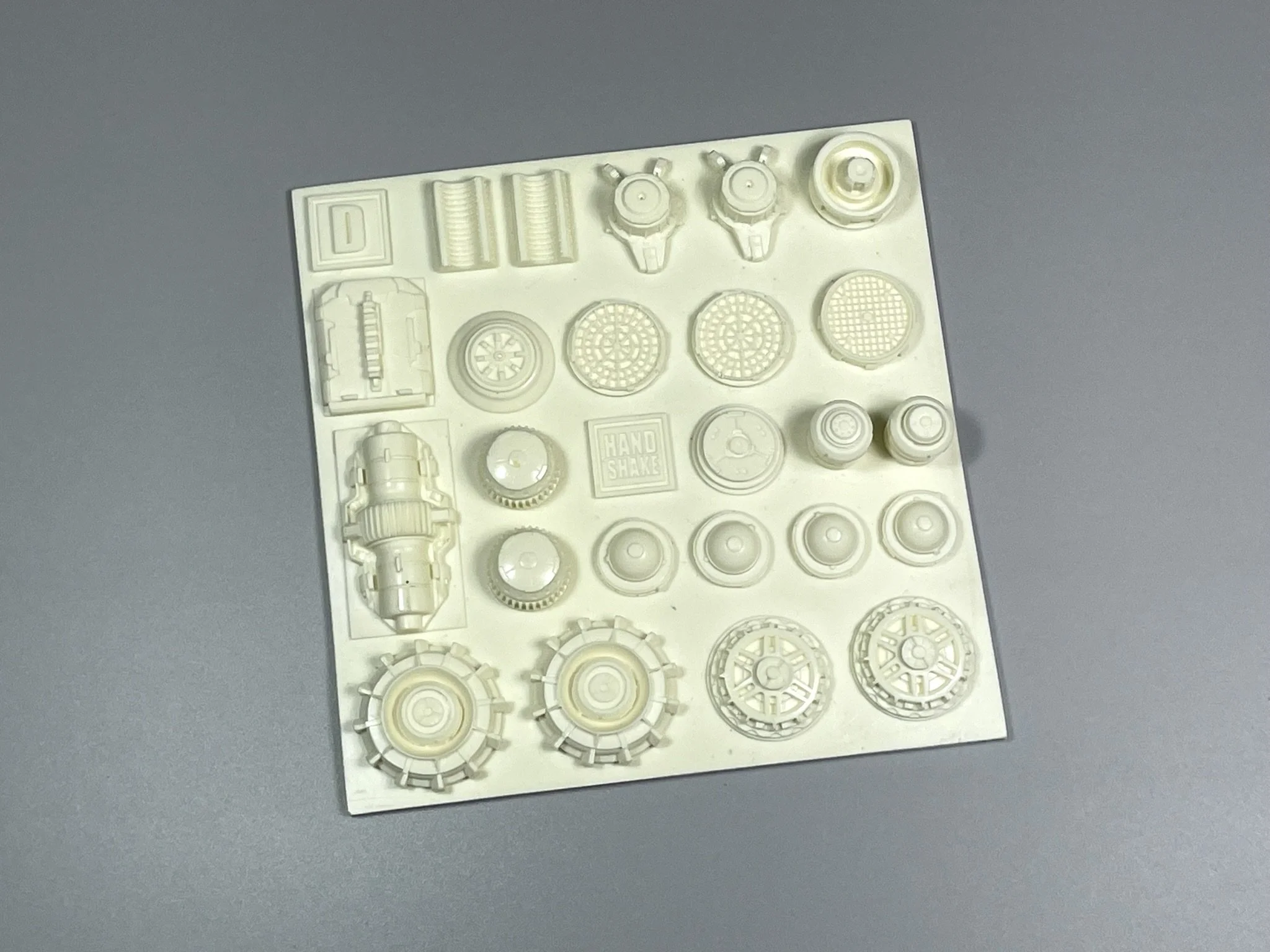 • The set consists of 54 different parts, some of them duplicated to offer modelers more possibilities, making a total of 80 pieces. All the parts are arranged on 4 flat-backed panels of 12 ×12 cm, allowing each panel to be cast as a single piece in polyurethane resin.